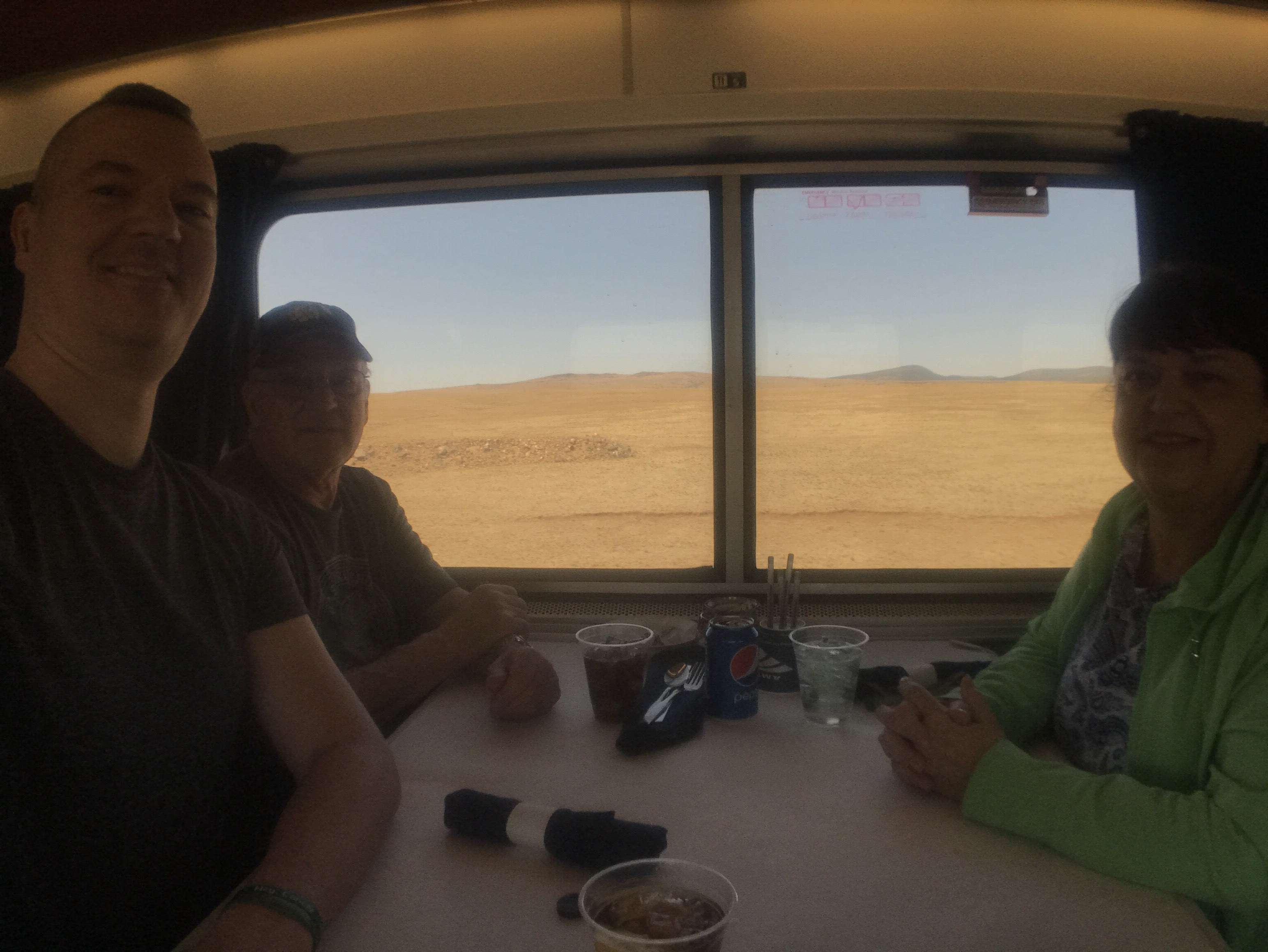 My Dad used to work fot the railroad many years ago, so he’s quick to make friends with railroad employees. He’s the guy on the left. This was yesterday (Wednesday) in La Junta, CO around 8:30am. They are watching 2 extra engines and 1 extra car being attached. It’s called dead heading, so sayeth my dad, and they won’t be used but are just hitching a ride with us. We are running about 2+ hours late to our destination and he thinks this hook up is part of the big delay we are having.