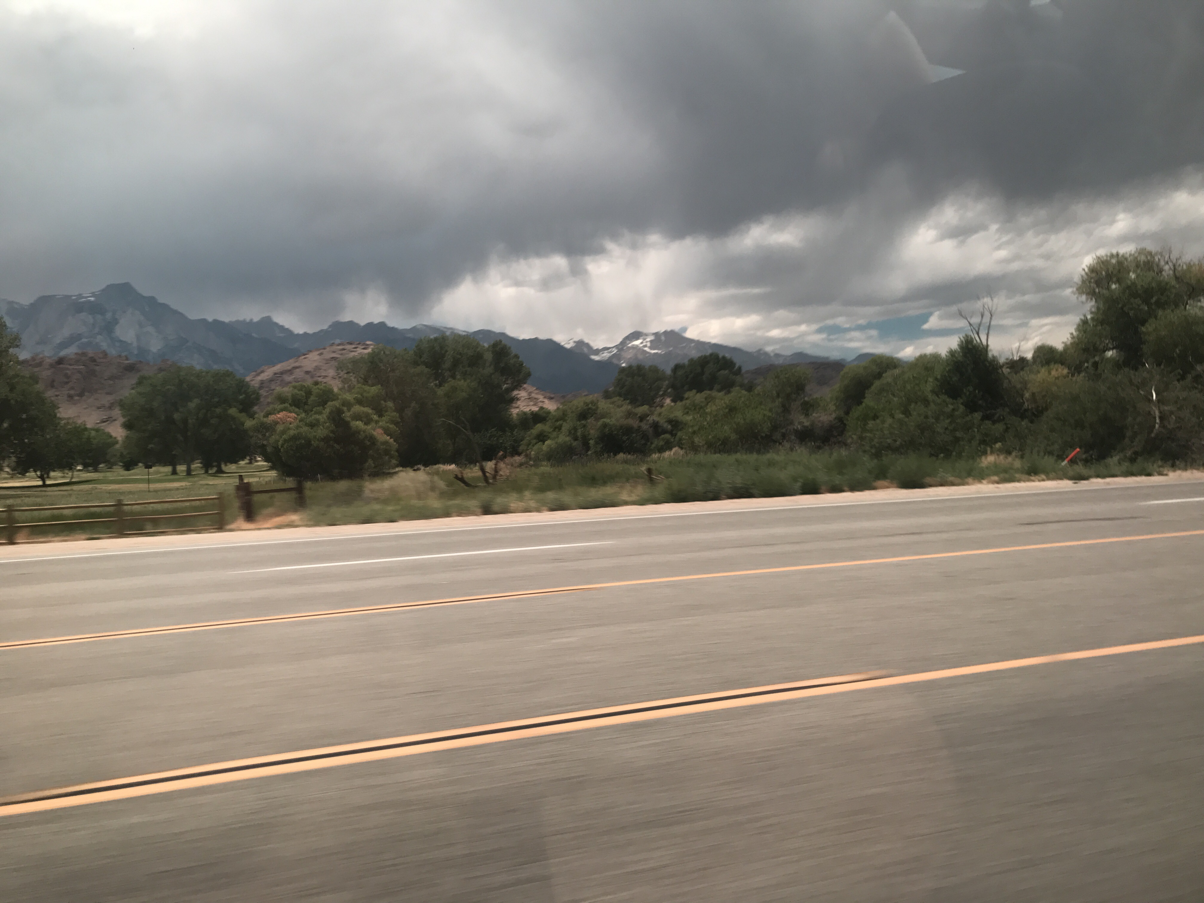 On the ride to Lone Pine the temp outside was 103, and then it rained on us a little. Crazy. Looking to the left/west there were heavy clouds over the Sierras.