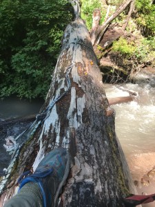 A little less than an hour later I had to cross another ‘hiker’ bridge. This time it was a large tree, on top of another large tree about 10 feet above the water. My leg was long enough that I could use my foot to reach the log underneath to help shimmy, slowly, across.