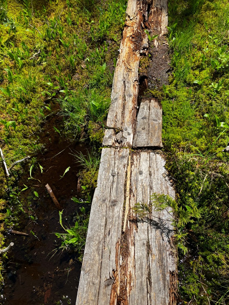 Seems like every so often, and more often than expected, we must walk over what I like to refer as balance beams. They are actually bog crossings, I believe. There are A Lot of them! Below is a typical beam. If you zoom in to the middle… you will see a snake just caught a frog. A frog which I scared while walking the beam. I have officially scared a frog to death. (Rimshot)